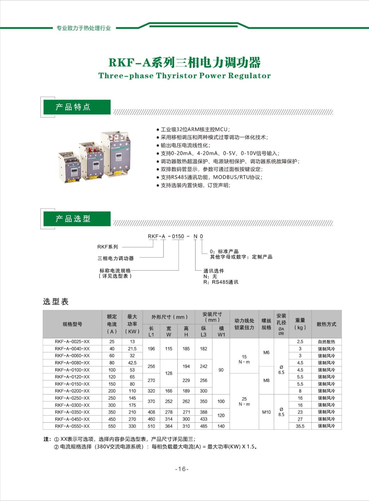 ★工業級32位ARM核主控MCU; ★采用移相調壓和兩種模式過零調功一體化技術; ★輸出電壓電流線性化; ★支持0-20mA、4-20mA、0-5V、0-10V信號輸入(默認4-20mA,其他訂貨聲明); ★調功器散熱超溫保護、電源缺相保護、調功器系統故障保護; ★雙排數碼管顯示,參數可通過面板按鍵設定; ★支持RS485通訊功能,MODBUS/RTU協議;